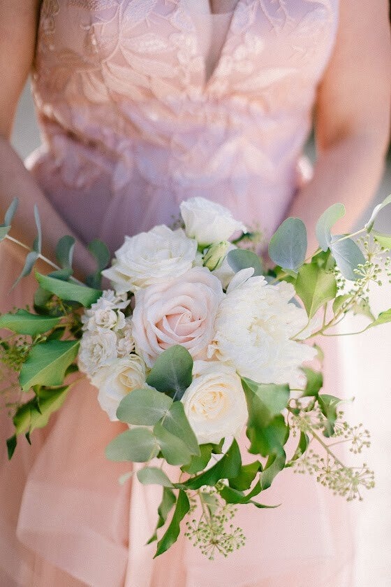 Ce bouquet de mariée (ou demoiselle d'honneur) incarne la simplicité sophistiquée et la fraîcheur. Il est porté sur une robe rose pâle ou nude, créant une harmonie douce et lumineuse.